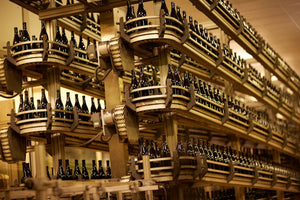 The design of the Cuverie was revolutionary for its time, it was built over five levels so all movement during the winemaking process could be carried out by gravity. Pinot Noir grapes are harvested and taken in small baskets to the Cuverie courtyard where they are weighed, sorted and de-stemmed. They are then taken to the first floor by lift in large double walled 'cauldron shaped' metal cars. Cold or hot water can be put in the wall of the cars to regulate the temperature of the grapes as needed. Each new stage of the winemaking process is marked by a move down to the next floor of the winery which ends in the cellars where the wines are matured in oak barrels. Chardonnay grapes are pressed after sorting and then put directly into barrels for the entire winemaking process.